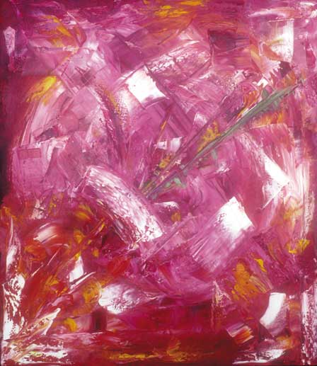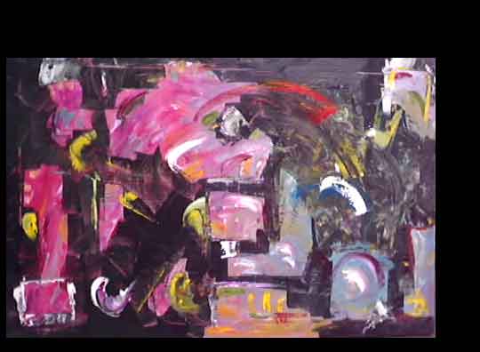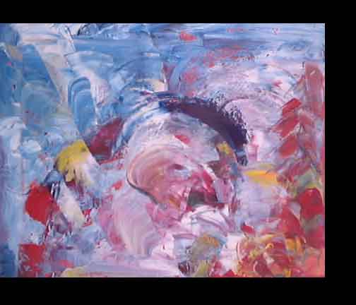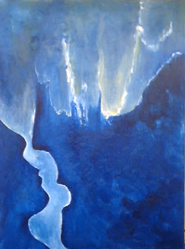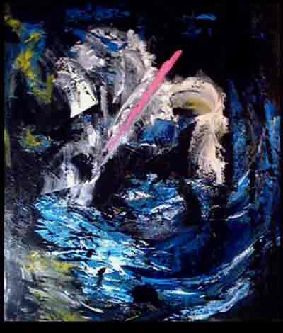I painted my analysis. This canvas was very disturbing to work on. The black and red keys on the left are the locked patterns from childhood. Everything is fine until something hits our heart deep enough and we crumble more or less to pieces. A necessary process to our inner growth. The circle on the lower right is the therapeutic process of looking into the pains then ascending step by step to wellness. Althought I painted this quickly without thinking it through at all in the moment, all made sense to me looking at it after a few days, knowing what I was going through emotionally at the time. But there was one thing I couldn't understand in the canvas and why I did it in the early stage of the painting, right after painting the so called patterns keys. The impulsion of the brush surprised me at the time. 6 months later, a client came through my office, looked at it quite intensely and suddendly said "My God it's September 11...! I was stupefied, looked at the canvas again and suddenly understood why I painted that blue line across the Towers. Private collection |